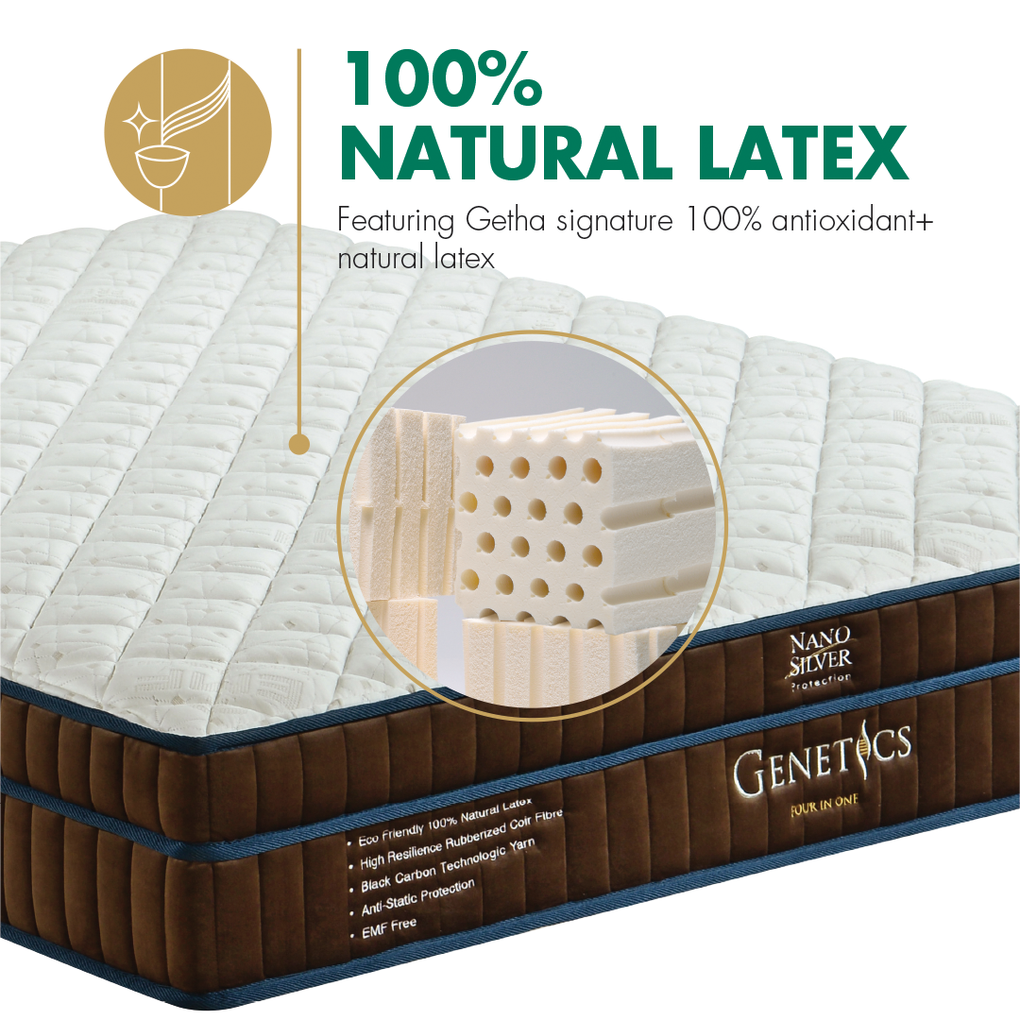 Made for functional comfort and support, the GENETICS Four-In-One encourages a healthy sleep environment with germ protecting Nano Silver embedded fibre yarn and Anti-Static stress relief protection. Designed with four of the best quality materials and carefully constructed multi-layer system for superior lasting comfort – 100% natural latex, natural rubberised coconut husk fibre, memory foam and high resilient foam, the GENETICS Four-In-One is a great choice for side and front sleepers looking for a medium to medium firm feeling.